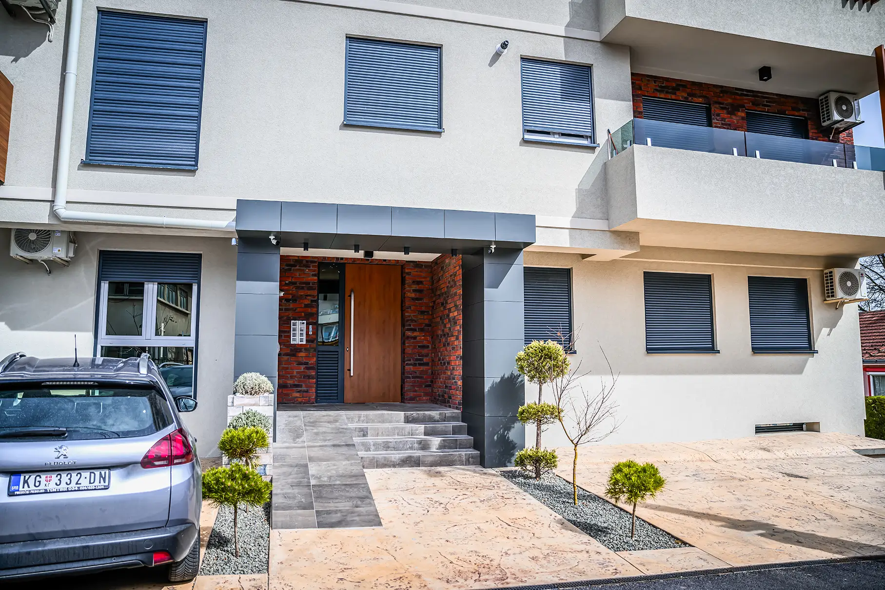 Objekat ukupno poseduje 14 parking garažnih mesta, kao i dovoljan broj parking mesta na parceli, predviđenih za stanare i posetioce, u skladu sa propisanim dimenzijama i normativima u Srbiji.