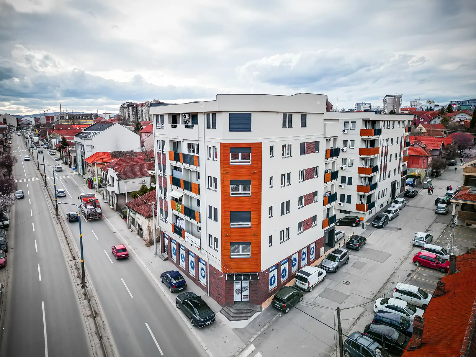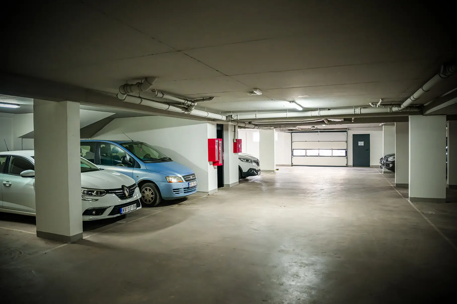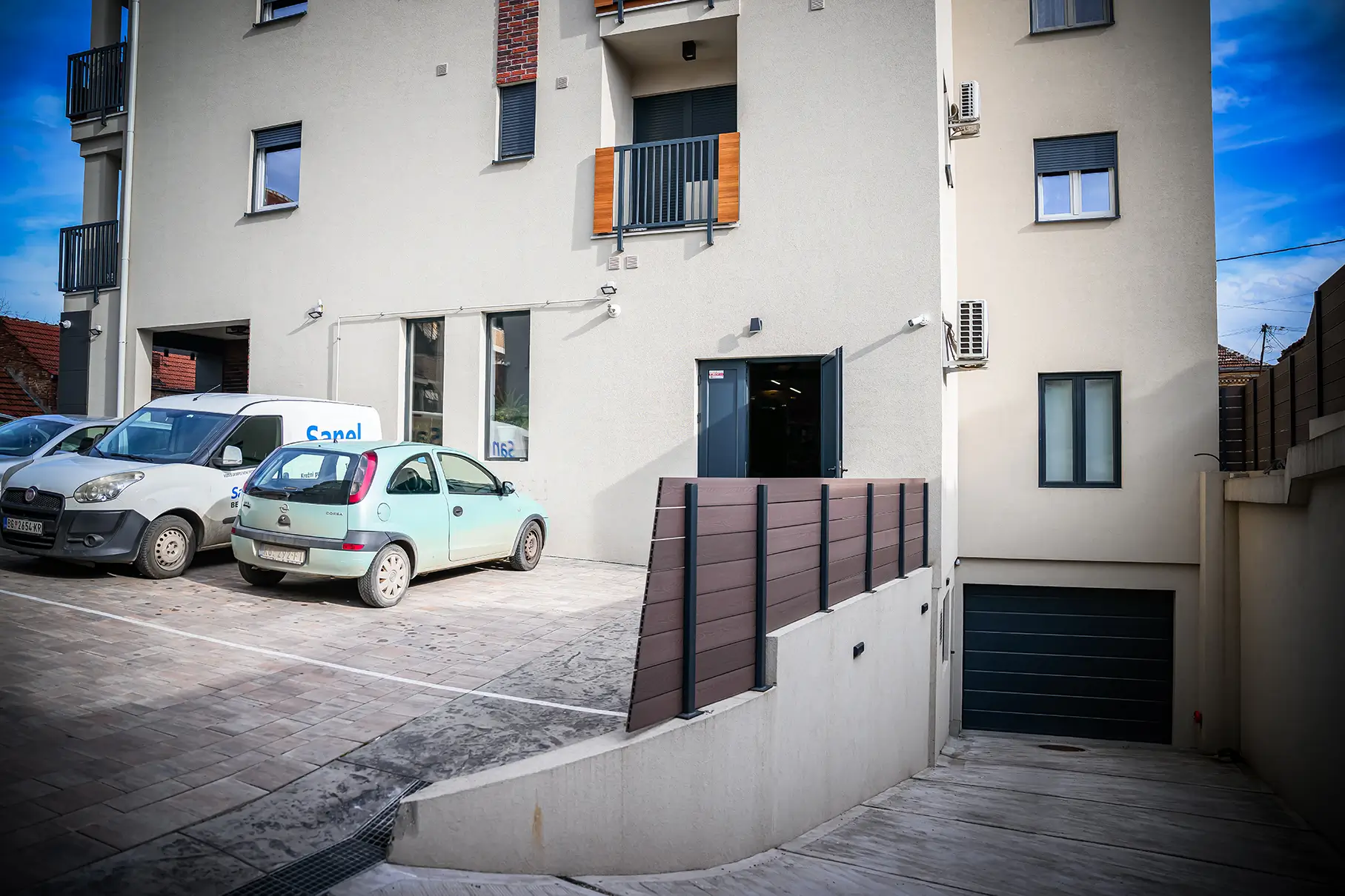 Parkiranje je rešeno u okviru parcele i dve podzemne garaže gde ima dovoljan broj parking mesta za svaku stambenu jedinicu zasebno, kao i za poslovni prostor.